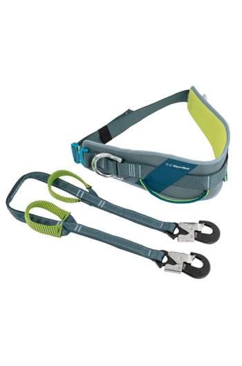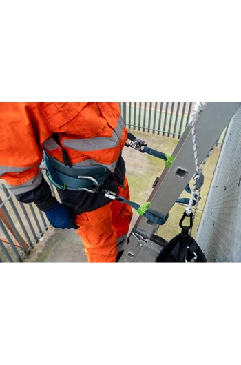 After climbing into position, the worker clips one point to the left side of their waistbelt and one point to the right. They now have dual work positioning points:-