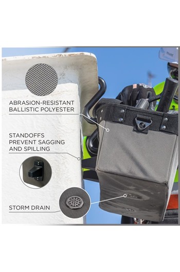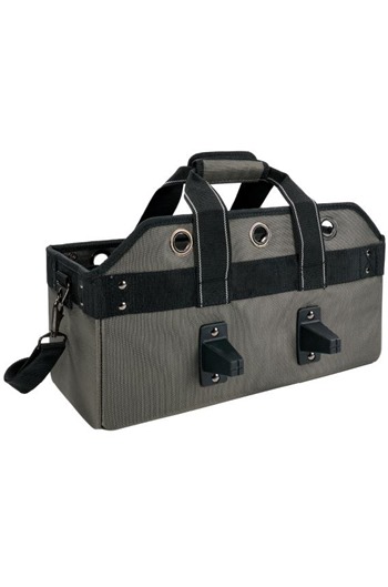 The Arsenal 5844 Bucket Truck Tool Bag is designed to hang from aerial bucket hooks for secure storage, convenient tool organization, accessible tethering and prevention of dropped objects. Using a hanging tool bag maximizes space in compact buckets by keeping gear off the floor and out of the way. Unlike most other bucket storage solutions, this portable bag has a rigid freestanding base and carrying straps for versatile use in and out of buckets—preventing workers from needing an additional tool bag for other work environments. Also features standoffs on the side of the bag to keep it upright when hanging inside a bucket.