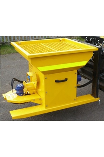 A hydraulically driven salt spreader/gritter for use with forklift trucks, with conveniently placed fork pockets which allow attachment to the lift tines in a safe and effective manner