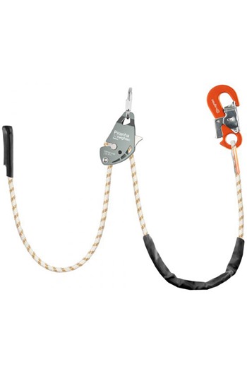 PIRANHA adjustable lanyard with safety hook connector is a compact device used for work positioning on masts, towers, pylons or other lattice structures in the telecoms, power and entertainment industries