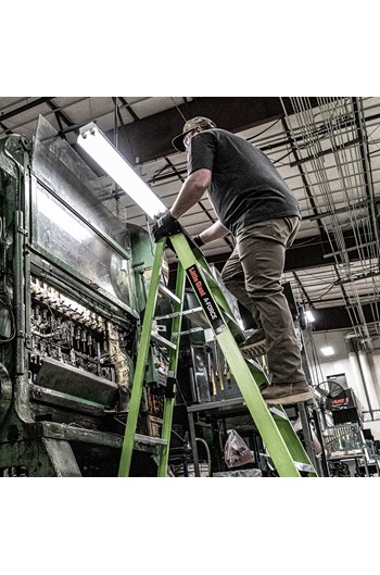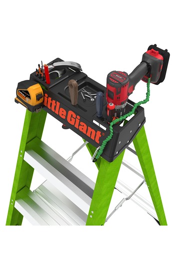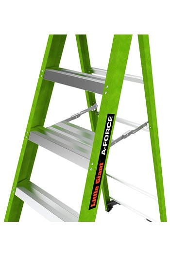 The A-Force from Little Giant sets up quick, transports easily, and performs like a pro. Every. Single. Time. With a patent-pending spreader step, versatile top cap, and sturdy full-boxed steps, this A-frame will help you get stuff done for years to come. Easy setup with built-in comfort treads. These oversized treads make working on the A-Force comfortable.Versatile Top Cap – Four ports on the sides and rear of the top cap accept compatible Little Giant accessories, such as the Loot Box or Strap Holder. Add a few drill bit holders, clip holsters for drills and tape measures, friction locks for gallon and quart cans, and a magnetic fastener tray, and you’ve got a full toolbelt at the top of your ladder. Non-conductive, Hi-Viz Green Fiberglass – Made from durable, lightweight fiberglass, this A-frame lets you work fearlessly around electricity