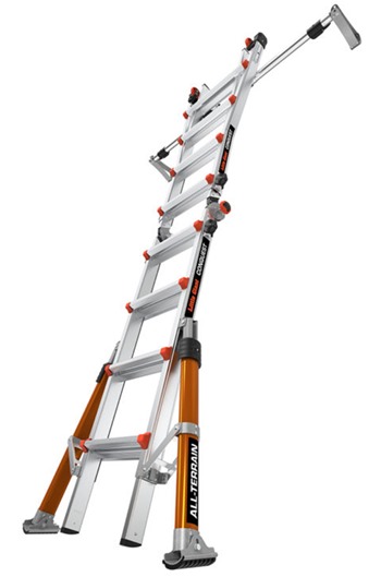 The Little Giant® Conquest All-Terrain™ PRO is the ladder. The only ladder you’ll likely ever need to buy! With built-in side-mounted stabilising legs that work on uneven ground and a swivel foot that easily handles flat or soft ground. That’s all at the bottom of the ladder. The top has new safety features, including the side-mounted SafetyRails, for use as walkthrough rails to get up and onto a roof, for example, or switch to use the Safety Rails as a wide ladder standoff significantly increasing stability at the top