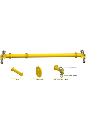 The MOD24 Spreader Beam consists of 1x pair of 500mm End Units and Drop Links, 2x 17ton Alloy Bow Shackles and 2x 12ton Alloy Bow Shackles, with intermediate struts that can be bolted into the assembly to achieve different spans (MAX SPAN OF BEAM = 6MTRS), please see below for configurations (different configurations and extra struts are available, please contact our sales team for more information):-