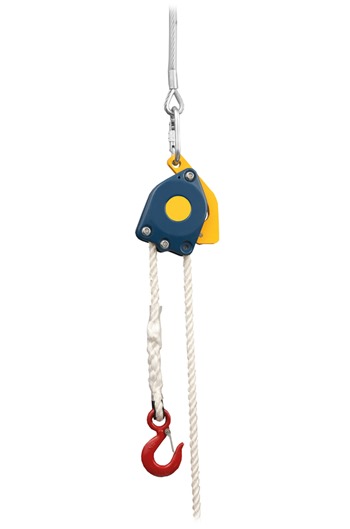 - The pulley is equipped with a mechanism for braking the load if the operator who lifts the load releases the rope.