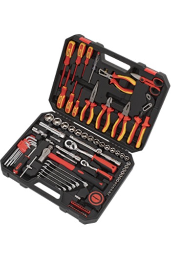 Includes 1/4" and 1/2"Sq drive sockets, hex keys, spanners, screwdrivers, mains tester, pliers, tape measure, ball pein hammer, scissors, bits and accessories