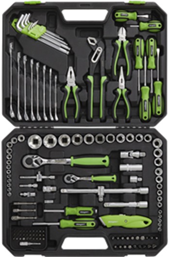 Includes 1/4", 3/8" and 1/2"Sq drive sockets, hex keys, combination spanners, screwdrivers, pliers, utility knife, bit set and accessories