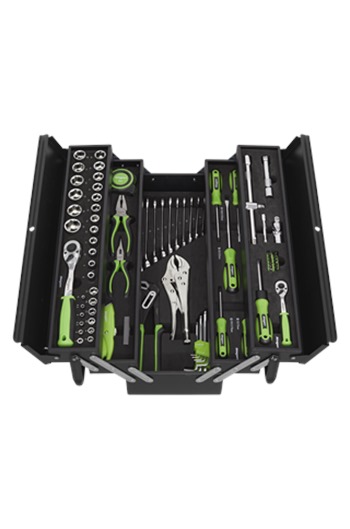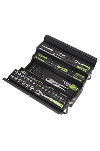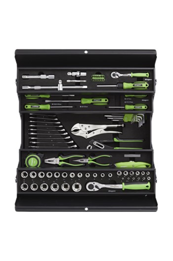 Includes 1/4" and 1/2"Sq drive sockets, hex keys, combination spanners, screwdrivers, pliers, utility knife, measuring tape, bit set and accessories